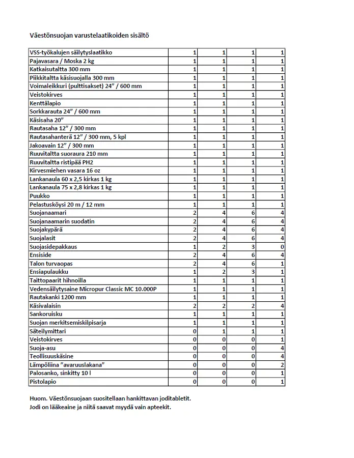 Katso laatikon tarkempi sisältö sisällysluettelosta ja valitse väestönsuojaanne oikean kokoinen laatikko. Kysy tarvittaessa lisätietoa sähköpostilla.
